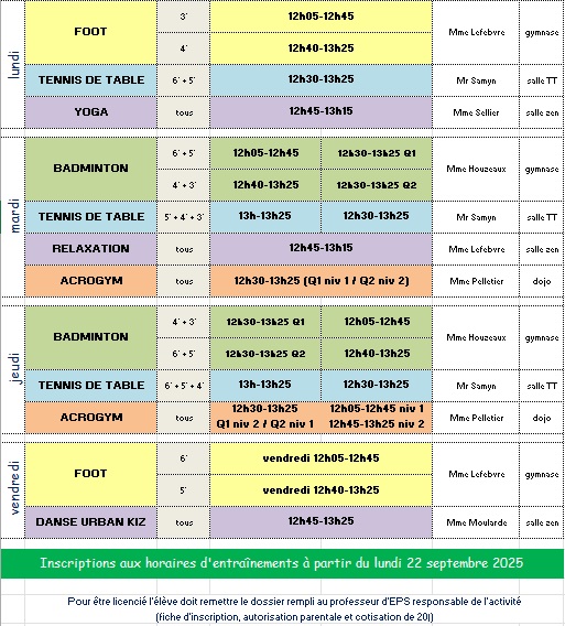 Le planning est finalisé (les activités proposées cette année : badminton, tennis de table, acrogym, futsal, yoga, relaxation).