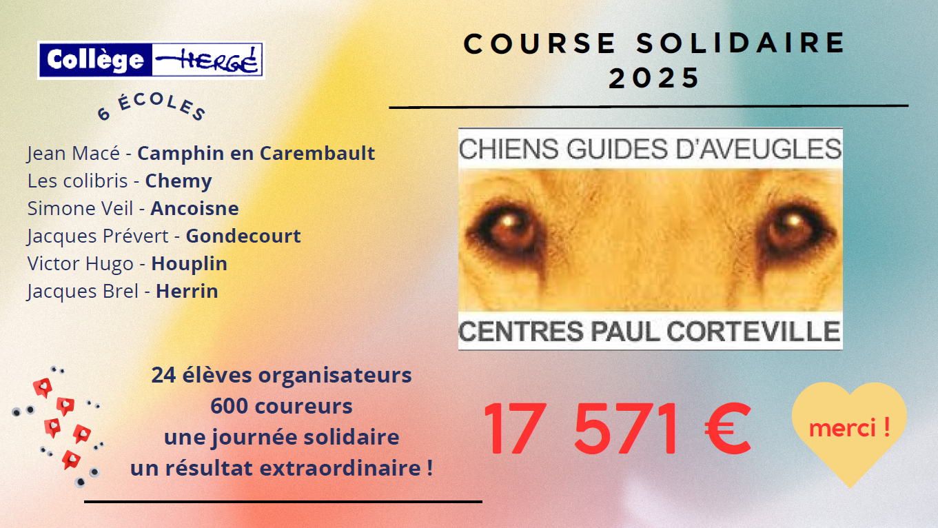 l'association des chiens guides d'aveugles du centre Paul Corteville est venue à 3 reprises au collège Hergé : le 4 mars pour présenter aux élèves l'association, le 3 juin jour de la course solidaire, le 24 juin pour la remise du don.
