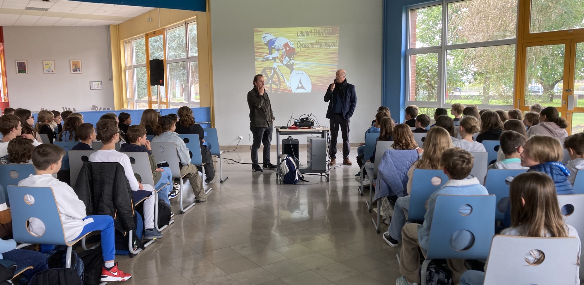 16 septembre 2024 : Laurent Thirionet, directeur de l'équipe de France de para cyclisme, multiple champion paralympique est venu à la rencontre des 130 élèves de 5ème pour 2h d'échanges et de partage : sport, handicap, résilience, persévérance
